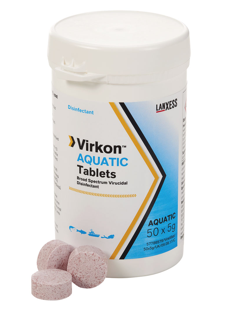 Virkon Aquatic tablets can be used as a sanitizer for your pond at the rate of one dissolved tablet per 5,000 litres, (1,000 gallons), per week. Virkon Aquatic can be used at the standard 1% solution (1 x 5gm tablet per 0.5lt clean water) to disinfect nets, equipment and surfaces, and all quarantine areas.